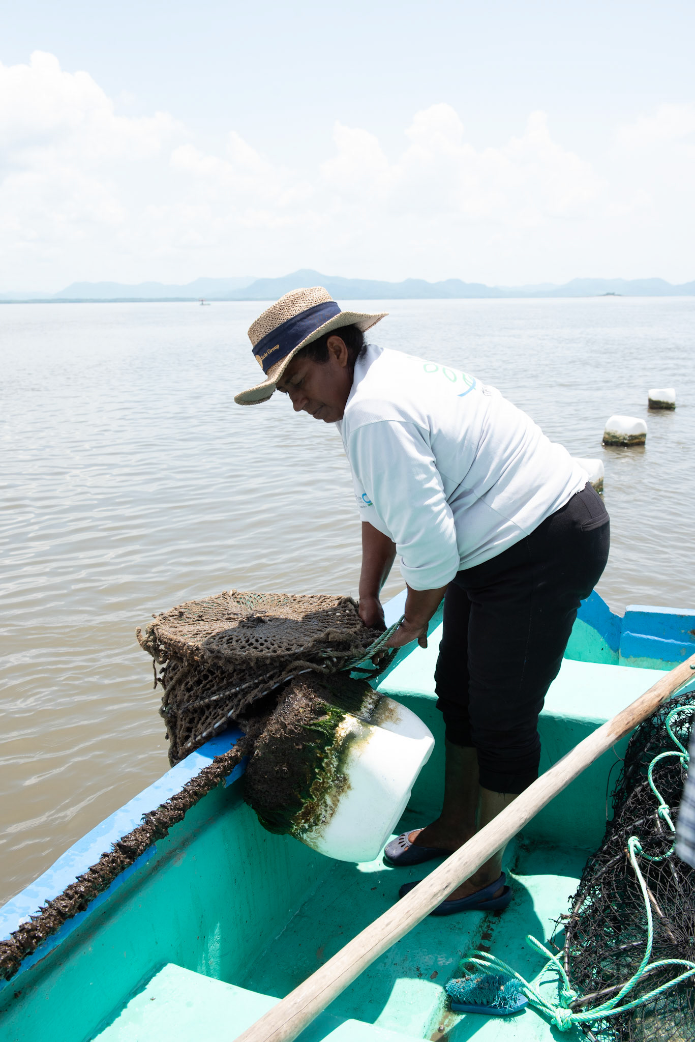 24-junio-2017. Este miércoles 24 de junio visitamos la zona de Puerto Palito en Costa Pajaros, Puntarenas. Desde los años 80, Doña Siday Arias, en conjunto con la Universidad Nacional, han dedicado tiempo para evaluar las posibilidades del cultivo de las Ostras en el Golfo de Nicoya. Hoy día cuentan con 6 granjas. En Puerto Palito, nos encontramos con un grupo de trabajadores que se encargaban cada uno de su tarea: limpieza, selección de Ostras por tamaño, llevar nuevamente al mar, a las que no cumplían con el tamaño mínimo para la comercialización (6cm), entre otras labores. Fotos: Nina Cordero. En la Fotografía: Eugenia Fernández (de sombrero de color crema) lanzaba una Linterna que contenia las Ostras que no estaban listas para la comercialización por el tamaño que no alcababan los 6cm, junto a Lorena Sequeira.